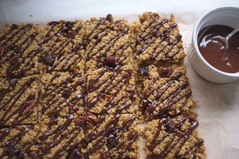 Les barres de céréale, pécan et canneberge sont décorées de chocolat noir pour les grands gourmands