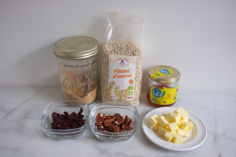 - Ajouter dans ce mélange les flocons d’avoine, les noix de pécan et les canneberges. Bien mélanger à l’aide d’une spatule en silicone. Verser cette préparation dans moule chemisé, bien lisser et aplatir, toujours avec la spatule.