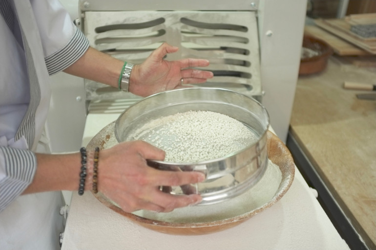 La farine de sarrasin tamisée à la main pour préparer la pâte de sarrasin qui servira à la fabrication des nouilles Soba