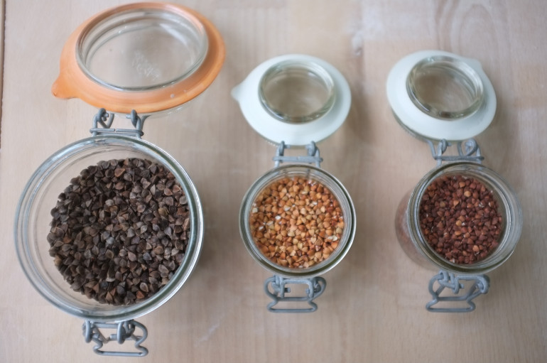Les trois couleurs du sarrasin : à gauche tout juste récolté, au centre décortiqué pour être broyé dans le moulin, à droite torréfié