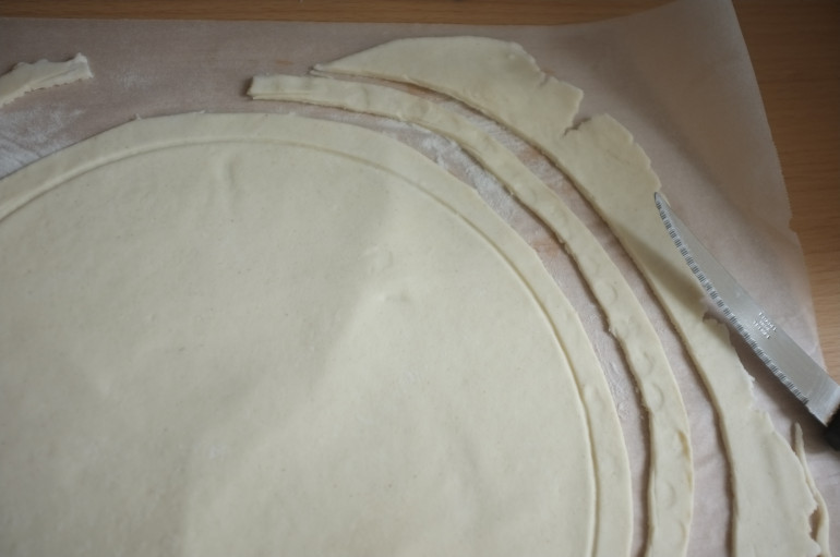 Pour la seconde pâte, faire de même mais découper en ajoutant 1 cm de plus aux bords : elle serra la pâte du dessus et le centimètre supplémentaire permettra de sceller les deux pâtes ensemble. Sur la plaque de cuisson, recouverte d’un papier cuisson, déposer la pâte du dessous, et badigeonner les bords (d’une largeur de 1 cm environ) avec le glaçage, à l’aide d’un pinceau. Coller alors des lamelles de chutes de pâtes pour former une bordure. Cette bordure empêche la frangipane de couler sur les bords et accentue le côté feuilleté des bords de la galettes.