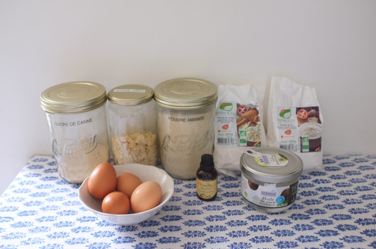 - Dans un large bol, mélanger ensemble les ingrédients secs : la farine de riz, la farine de millet et la poudre d’amande. Garder de côté.