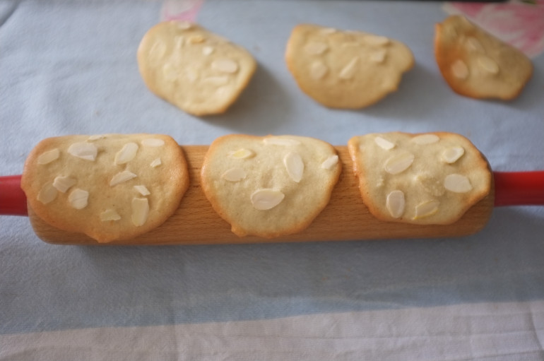 - Cuire environ 10 minutes. Un fois les bords des tuiles dorées, retirer la plaque du four, décoller les tuiles immédiatement du papier cuisson (en glissant dessous une fine lame de couteau par exemple) et déposer les tuiles encore bien chaudes sur l’arrondie des rouleaux à pâtisserie. Appuyer délicatement pour que les tuiles prennent forme et laisser refroidir ainsi. Précéder de même avec la fournée suivante.