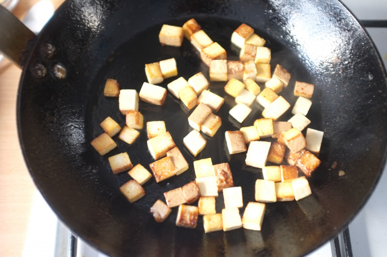 ans une poêle, faites chauffer l'huile d'olive et faites dorer les cubes de tofu quelques minutes.
