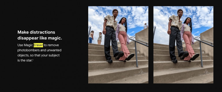 Fort de sa double casquette de concepteur de la partie hardware et du logiciel de ses smartphones Pixel, Google a offert plusieurs fonctionnalités inédites à ses derniers Pixel 6. La plus surprenante est probablement la "gomme magique" de l'appareil photo qui utilise l'intelligence artificielle pour effacer les éléments indésirables d'une image sans avoir à la retoucher dans un logiciel spécialisé. L'application photo se charge de compléter l'image à partir des pixels qui la composent afin qu'elle reste réaliste.