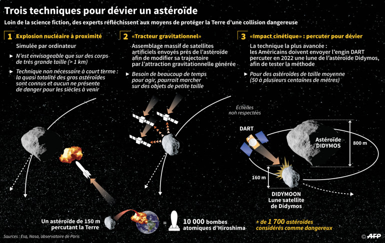 De quelles parades dispose l'humanité en cas de chute d'un astéroïde sur Terre ? Tout dépend de la taille de ce dernier et du temps dont on dispose pour agir. "Pour les astéroïdes de toute petite taille, inférieurs à 50 mètres, avec un temps d'impact très court, la seule chose que l'on puisse faire, c'est de prédire le point d'impact et d'évacuer la zone", a déclaré à l'AFP Ian Carnelli, chef du projet AIM (Asteroid Impact Mission) à l'Agence spatiale européenne (ESA). Si l'objet est plus gros, l'idée est d'éviter la collision en déviant l'astéroïde, souligne Daniel Hestroffer, de l'Observatoire de Paris.