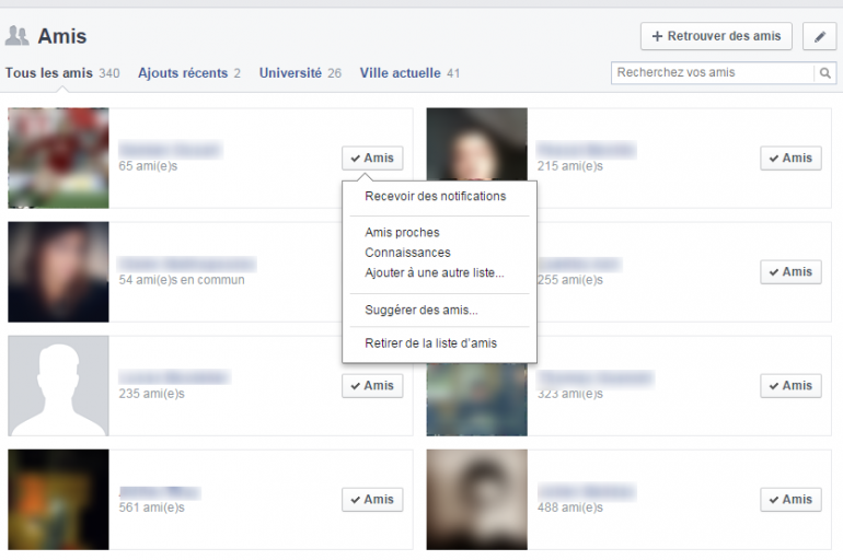 Cliquez sur l'onglet "Amis" afin d'accéder à l'ensemble de votre liste d'amis. Passez votre souris à côté de chaque photo afin de répartir vos connaissances dans les listes voulues.