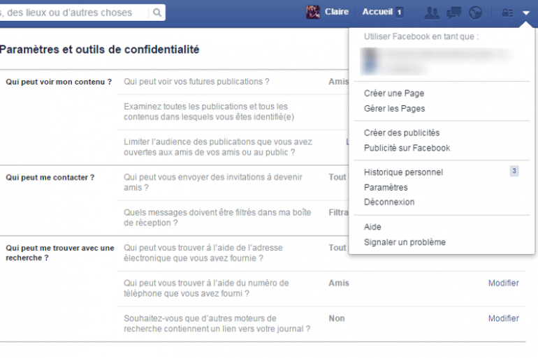 Vous pouvez gérer les informations plus en détails dans "paramètres" puis "confidentialité". C'est le cas pour les recherches de votre profil mais aussi de votre nom sur les moteurs de recherche. Dans les paramètres et l'onglet "confidentialité", vous pouvez gérer ces recherches et éviter que votre profil Facebook arrive en tête sur Google par exemple.