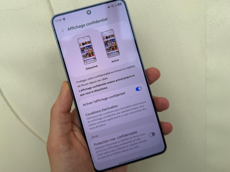 Conçue par la branche Samsung Display du constructeur coréen, cette innovation exclusive au Galaxy S26 Ultra - le modèle le plus sophistiqué de la nouvelle gamme proposé à partir de 1.469 euros - fonctionne comme un filtre de confidentialité pour ordinateur et permet de masquer les informations importantes et d'empêcher les curieux de lire ce qui s'affiche sur l'appareil. Un simple bouton accessible depuis le centre de contrôle permet de passer du mode standard au mode protégé en quelques secondes.