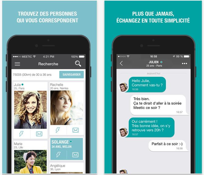 Site de rencontres à l'origine, Meetic a décliné son service sur une application mobile payante (19,99 euros par mois). Celle-ci permet d'accéder à toutes les fonctionnalités du site web. Mais elle tire aussi profit des spécificités du mobile en intégrant un mode Shuffle (aléatoire) qui se rapproche des deux applications citées ci-dessus.