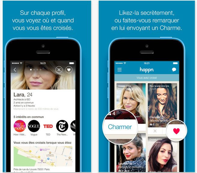 Lancée début 2014 par trois entrepreneurs français, Happn mise sur le coup de foudre à la française. Plus encore que Tinder, Happn mise sur la géolocalisation. Son slogan en atteste : "Retrouvez qui vous croisez". Grâce au GPS du téléphone, elle propose de forcer un peu le destin en permettant de retrouver la jolie fille croisée à la sortie du métro ou en boîte de nuit. À condition, bien sûr, qu'elle utilise l'application, comme un million d'utilisateurs un an après ses débuts.