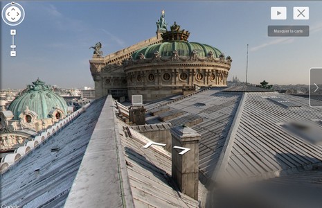 Grâce à ce petit chariot l'internaute se rend dans des endroits habituellement fermés au public. En quelques clics, il se retrouve sous un ciel bleu, au loin il voit la Tour Eiffel, le Sacré Coeur : bienvenue sur le toit du palais Garnier. Avec les flèches de son clavier, il se dirige vers les ruches de l'Opéra, frôle les figures dorées qui personnifient la musique, la poésie ou encore la comédie, il s'approche de la coupole qui couvre la salle de spectacle.