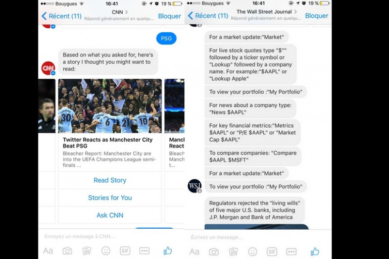 Facebook a officialisé l'évolution de sa messagerie instantanée Messenger avec l'arrivée des chatbots. Ces programmes informatiques capables de simuler une discussion avec les humains grâce aux progrès de l'intelligence artificielle permettront de réaliser n'importe quelle tâche du quotidien sans quitter le chat Facebook. Une trentaine de partenaires américains testent actuellement cette fonction, notamment CNN et le Wall Street Journal qui proposent des informations ciblées et des résumés d'actualité. Les interactions sont pour l'instant limitées à un choix entre plusieurs réponses ou à une liste de commandes. Les marques peuvent également solliciter l'utilisateur en envoyant des messages personnalisés ou sponsorisés.