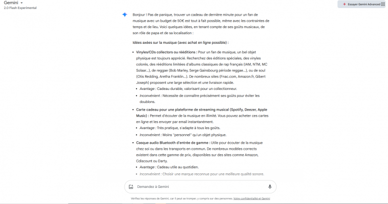 Ces IA peuvent aussi fournir des liens renvoyant directement vers des sites d'achat et classer les suggestions par prix, disponibilité ou popularité. La pertinence des suggestions dépendra des informations que vous allez fournir. Si vous donnez trop peu d'éléments, vous risquez d'obtenir des idées peu originales.