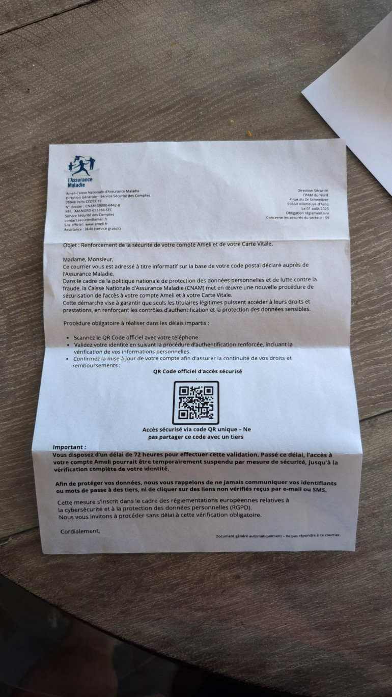 Ces courriers, remplis de références et logos officiels, se présentent comme une simple note "à titre informatif" et visent à informer les assurés d'une "nouvelle procédure de sécurisation de l'accès à leur compte Ameli et à leur Carte Vitale", qui impliquent notamment un renforcement de l'authentification. Un QR code unique figure en bas de page pour attester de son identité et confirmer la mise à jour du compte. La démarche doit être réalisée dans un délai de 72 heures, faute de quoi l'accès au compte Ameli risquait d'être suspendu par mesure de sécurité.