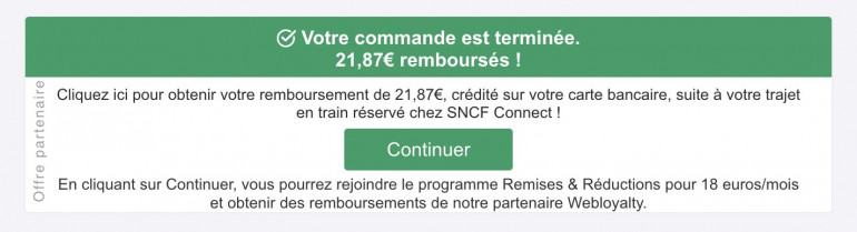 Bientôt la fin des offres de cashback payant sur le site de la SNCF ? Le gouvernement va échanger avec la compagnie à propos des offres de remboursement proposées à ses clients par le partenaire WebLoyalty sur le site SNCF Connect. Ces messages promotionnels affichés après la réservation d'un billet de train en ligne - mais aussi sur les principaux sites marchands, comme Fnac-Darty, Leclerc ou Cdiscount - consistent à proposer le remboursement d'une partie du montant de l'achat sur la carte de crédit de l'usager. Mais ils sont très décriés car ils impliquent, de façon peu transparente, un abonnement payant au programme de fidélité "Remises et réductions" de la société Webloyalty, facturé 18 euros par mois, qui coûte souvent plus cher qu'il ne rapporte.