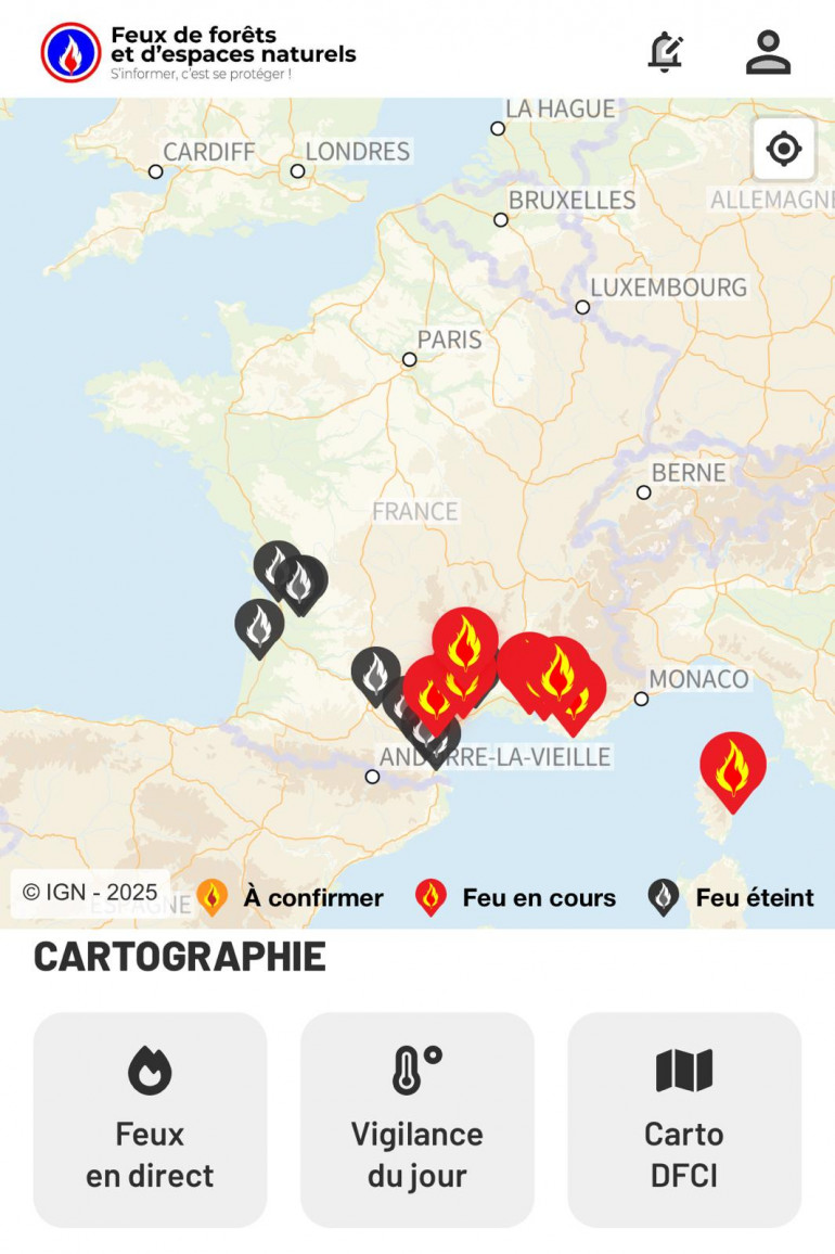 L’application Feux de Forêt est la référence pour suivre les incendies en temps réel. Disponible sur iPhone et Android, elle combine les données officielles de l'Office national des forêts avec les signalements de la communauté pour répertorier les feux en cours mais aussi ceux récemment éteints.