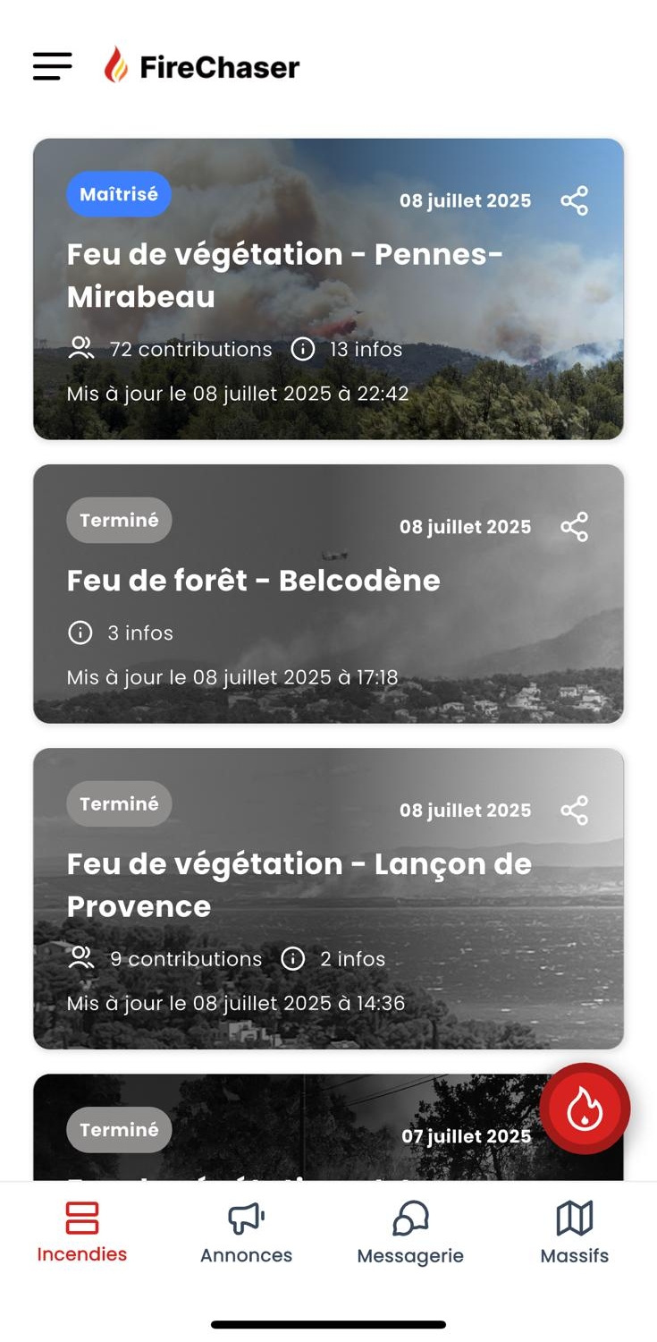 Pour les habitants et les randonneurs des Bouches-du-Rhône, l'application Fire Chaser est un complément précieux. Lancée en 2018 après les importants incendies des étés 2016 et 2017 dans le département, elle propose un suivi collaboratif très détaillé des incendies avec la localisation des foyers en temps réel, des photos, le statut des feux (en cours, maîtrisé, terminé) grâce à un réseau de bénévoles issus de la société civile présents sur le terrain. Sa page Facebook est aussi une source d'information précieuse avec plus de 60.000 personnes actives. La couverture s'étend progressivement à toute la région PACA.