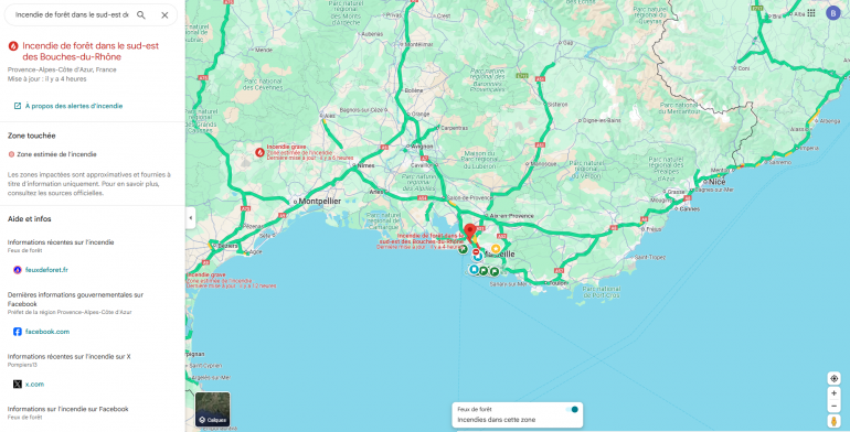 De façon plus spécifique, Google Maps a ajouté l'an passé une fonctionnalité de suivi des feux de forêt qui met en avant les zones concernées par des incendies et rassemble des informations pratiques fournies par les autorités locales. Pour l'activer, il faut sélectionner le calque "Feux de forêt" dans l'interface dédiée aux calques en haut à droite de l'application ou en bas à gauche de la version Web.