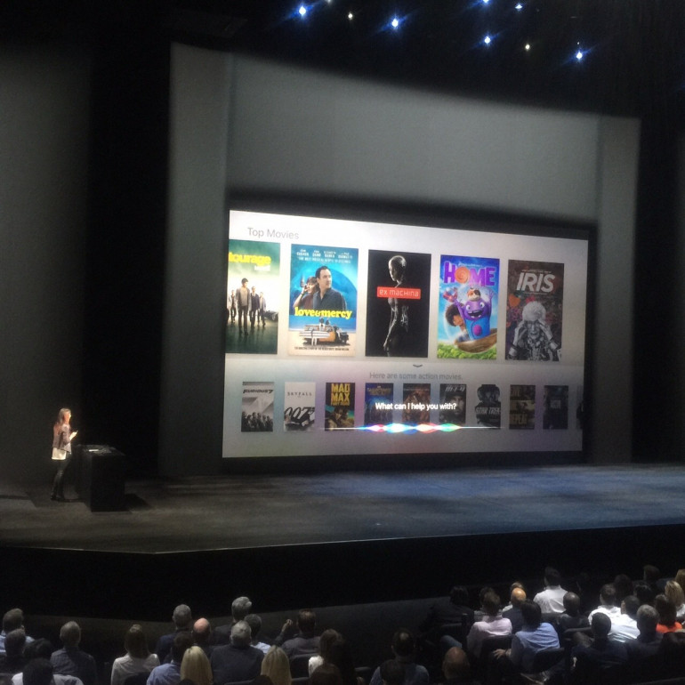 Avec la nouvelle version de l'Apple TV, qui embarque désormais Siri, Apple améliore son offre en matière de télévision. Composée d'un boîtier pour le téléviseur et d'une télécommande tactile équipée d'un micro pour communiquer avec Siri, l'Apple TV fait aussi la part belle aux jeux vidéo. Elle permet aussi d'écouter de la musique et de regarder des photos. Aux États-Unis, Apple annonce des accords avec HBO et Netflix mais aucune précision n'a été apportée pour la France.