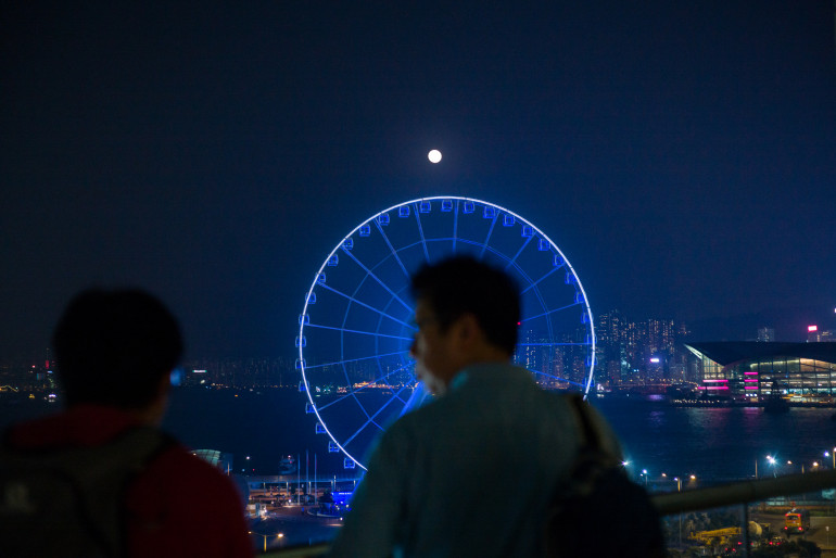 À Hong-Kong, des touristes et des salariés travaillant face au front de mer ont observé le lever de Lune au-dessus des gratte-ciel de la ville.