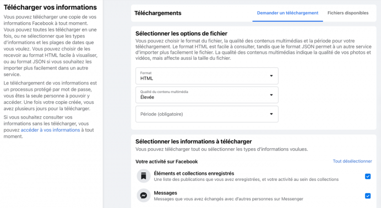 Deux formats sont proposés. Il est possible de recevoir ces informations au format HTML "pour les visualiser plus facilement", explique Facebook, même si la mise en page ne sera pas aussi claire et aérée que sur le réseau social. Vous pouvez aussi choisir le format JSON pour importer les données directement dans un autre service.