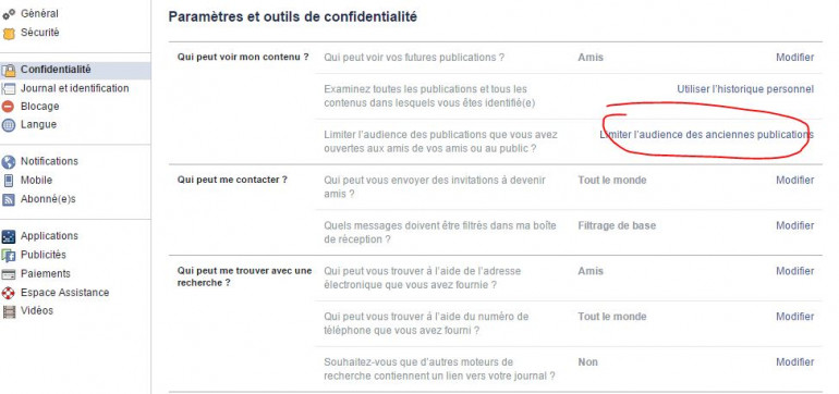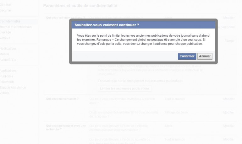 Après avoir repris le contrôle de vos futures publications il convient aussi de s'assurer que les anciennes ne seront pas scannées par le moteur de recherche. Il faut pour cela aller dans les paramètres de confidentialité puis cliquer sur "Limiter l'audience des anciennes publications" et répondre oui à la mise en garde de Facebook sur le caractère définitif de l'action que vous vous apprêtez à exécuter. Votre profil sera alors remis "par défaut" et vos anciens posts seront seulement accessibles à vos amis.