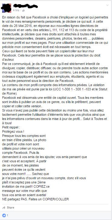 "En raison du fait que Facebook a choisi d’impliquer un logiciel qui permettra le vol de mes renseignements personnels, je déclare ce qui suit : À cette date du Dimanche 20 septembre 2015, en réponse aux nouvelles lignes directrices de Facebook et en vertu des articles L.111, 112 et 113 du code de la propriété intellectuelle, je déclare que mes droits sont attachés à toutes mes données personnelles, dessins, peintures, photos, textes etc… publiées sur mon profil. Pour une utilisation commerciale de ce qui précède mon consentement écrit est nécessaire en tout temps...".