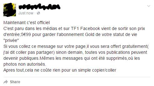 Depuis quelques jours, ce type de message fleurit à nouveau sur le plus grand réseau social de la planète. Un exemple : "Maintenant c'est officiel. C'est paru dans les médias et sur TF1 Facebook vient de sortir son prix d'entrée; 5€99 pour garder l'abonnement Gold de votre statut de vie "privée". Si vous collez ce message sur votre page,il vous sera offert gratuitement( j'ai dit coller pas partager) sinon demain, toutes vos publications peuvent devenir publiques. Mêmes les messages qui ont été supprimés,où les photos non autorisés. Apres tout,cela ne coûte rien pour un simple copier/coller"