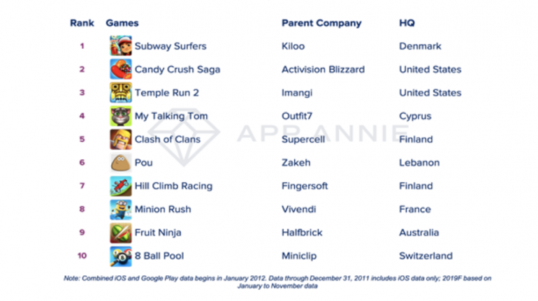 Enfin, du côté des jeux mobiles, le grand gagnant de la décennie est le titre Subway Surfers, qui profite notamment de sa forte popularité en Inde (15% des téléchargements) pour dominer Clash of Clans et Candy Crush Saga. Le titre Free Fire domine les douze derniers mois juste devant PUBG Mobile et Subway Surfers.