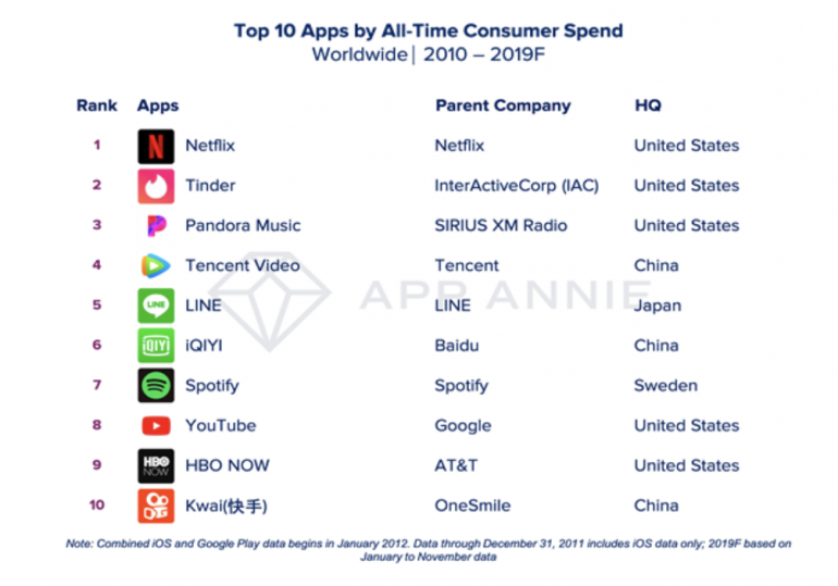 Selon les chiffres de Sensor Tower, Netflix aurait engrangé un chiffre d’affaires de 853 millions de dollars l’an dernier sur le seul App Store. Seule application de rencontre présente dans ces classements, Tinder a fait fructifier ses près de 5 millions d'abonnements premium offrant aux utilisateurs a possibilité de mieux mettre en avant leurs profils. Les deux applications sont toujours les plus rentables en 2019.