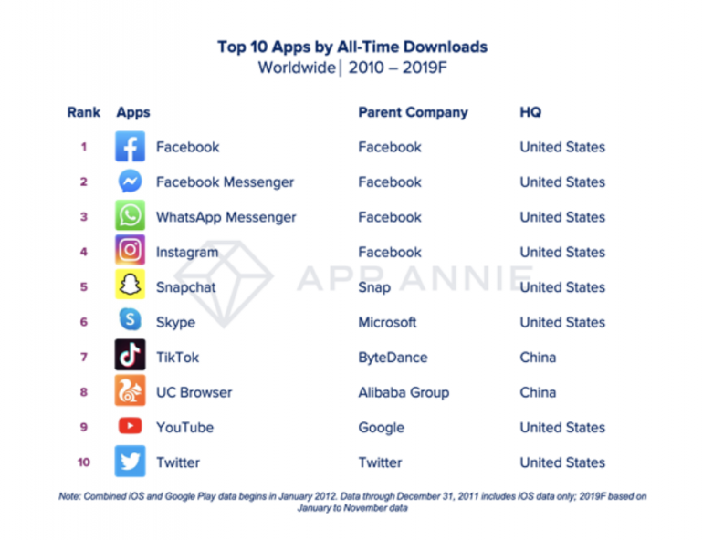 C’est le cas de TikTok, le réseau social de partage de vidéos à mi-chemin entre le karaoké et les filtres Instagram, qui a été téléchargé à plus de 1,5 milliard de reprises depuis sa création en 2016 et se hisse en trois ans à peine au septième rang des applications les plus téléchargées lors des dix dernières années. TikTok est aussi la troisième application mobile la plus téléchargée dans le monde en 2019, en dehors des jeux vidéo, derrière WhatsApp et Messenger et devant Instagram.