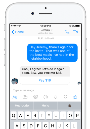 L'autre nouveauté traduit les ambitions de la plateforme dans le paiement en ligne. Messenger intègre désormais un chatbot, un assistant informatique automatisé capable de simuler une conversation avec un humain, afin de faciliter les transactions entre particuliers. Basé sur des algorithmes d'apprentissage automatique, il repère lorsqu'il est question d'argent dans une discussion (via des phrases clés comme "je te dois") et est capable de distinguer quelle partie doit rembourser l'autre. Il envoie alors automatiquement une proposition de remboursement proposant au débiteur de s'acquitter de sa dette.