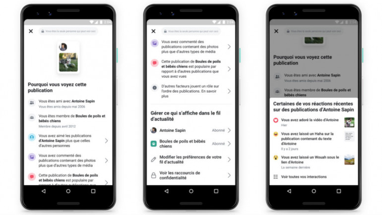 Cette fonctionnalité va apporter différentes informations expliquant comment les interactions passées impactent l'ordre d'affichage des publications dans le fil d'actualité. Elle permettra d'obtenir des détails sur l'auteur d'un post (un ami, un groupe, une page) et les raisons qui ont conduit Facebook à le faire remonter : parce que l'utilisateur est ami avec l'auteur de la publication, parce qu'il est membre de tel groupe depuis "x" années, parce qu'il aime régulièrement les publications de l'auteur du post, parce qu'il commente souvent des publications contenant des photos, etc.