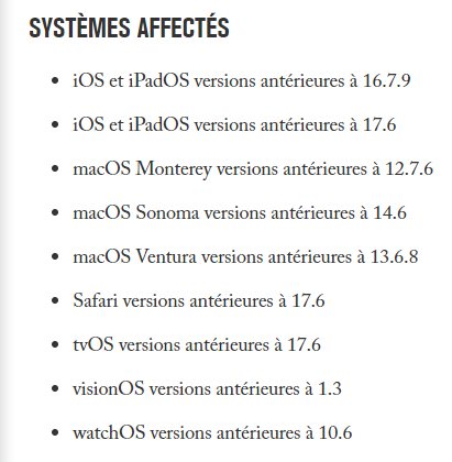 Afin de corriger ces failles dans ses systèmes, Apple a déployé une série de correctifs. Les utilisateurs d'iPhone sont invités à mettre à jour leur smartphone avec la version 17.6 d'iOS. Idem pour les propriétaires d'iPad avec iPad OS 17.6. Les autres patchs de sécurité sont accessibles dans les paramètres des appareils, dans la section "Mises à jour logicielles".