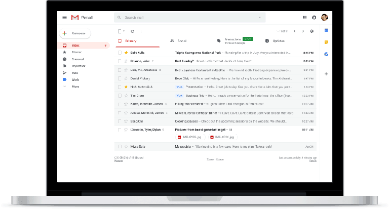 La messagerie inaugure une nouvelle interface. Le nouveau look est plus épuré avec des boutons modernisés. Des services de Google comme Calendar ou Tasks sont désormais accessibles depuis des raccourcis dans un bandeau en haut de l'écran donnant un aperçu des rendez-vous de la journée. Un menu fait son apparition au survol de chaque mail pour effectuer certaines fonctions plus rapidement (archiver, supprimer, snoozer, marquer comme lu, répondre). Il est aussi possible d'accéder aux pièces-jointes d'un message sans ouvrir la conversation.