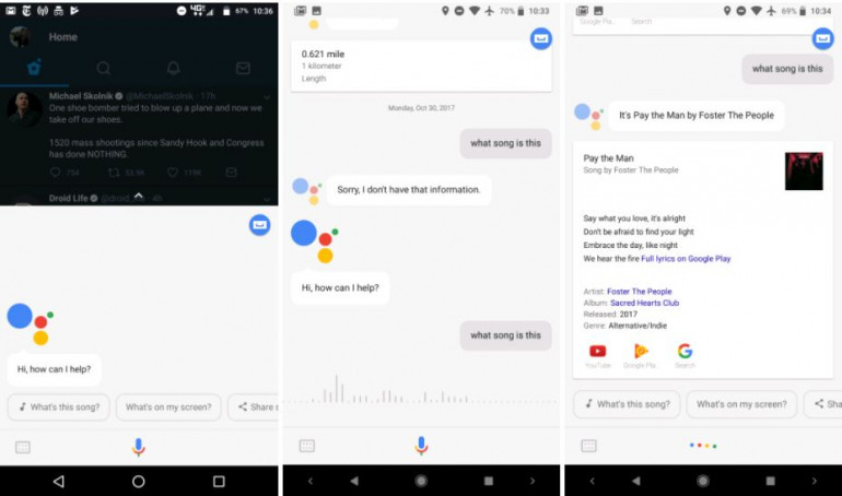 La reconnaissance vocale de Google Assistant peut être utilisée de deux façons. La première consiste à solliciter l'assistant en prononçant par exemple "Ok Google, quelle est cette chanson ?" ou en tapant cette requête au clavier. Google Assistant peut aussi reconnaître les titres joués à proximité d'un smartphone si elle détecte du son environnant.