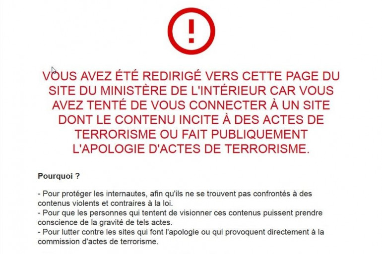 À la place du moteur de recherche et de l'encyclopédie en ligne, les internautes se sont vus notifier ce message : "Vous avez été redirigé vers cette page du ministère de l'Intérieur, car vous avez tenté de vous connecter à un site dont le contenu incite à des actes de terrorisme ou fait publiquement l'apologie d'actes de terrorisme". La redirection a été observée à la fois sur ordinateur et sur mobile.