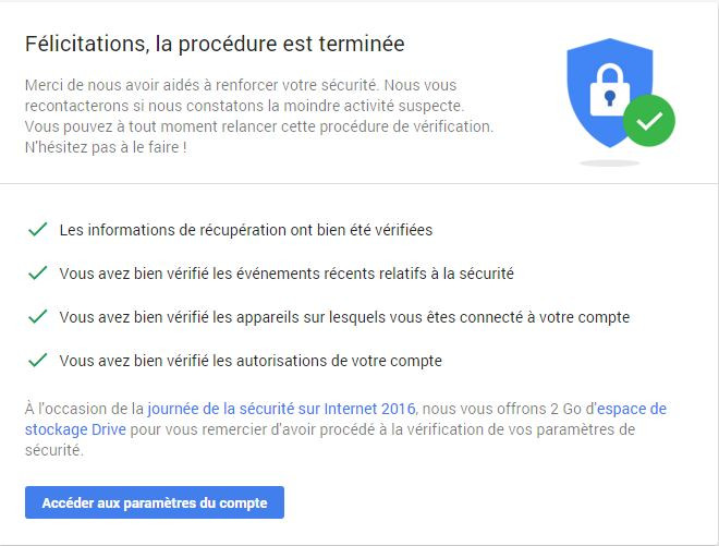 Si tout vous semble en règle, il n'y a plus qu'à valider et vous devez normalement bénéficier de 2 Go de stockage supplémentaire comme l'indique le message : "À l'occasion de la journée de la sécurité sur internet 2016, nous vous offrons 2 Go d'espace de stockage Drive pour vous remercier d'avoir procédé à la vérification de vos paramètres de sécurité". Pour vérifier qu'ils se sont bien ajoutés à vos 15 Go gratuits offerts initialement par Google, ou aux 100 Go de l'offre payante, il faut se rendre dans l'espace de stockage Google Drive.