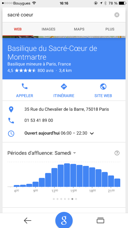 Aux États-Unis, cette fonctionnalité s'applique aux restaurants aussi bien qu'aux lieux touristiques. En France, tout n'a pas encore été répertorié pour le moment. Pas d'information sur le centre Pompidou de Metz ou le MuCem à Marseille par exemple, mais évitez en tout cas de visiter la basilique du Sacré-Cœur à Montmartre un samedi entre 13 heures et 18 heures.