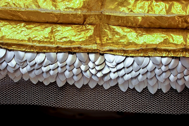 Les trois capteurs large bande de SEIS sont désormais enveloppés dans un large dôme blanc dont le pourtour intérieur est bordé par une jupe en cotte de maille similaire à celle qui équipaient les armures des chevaliers.