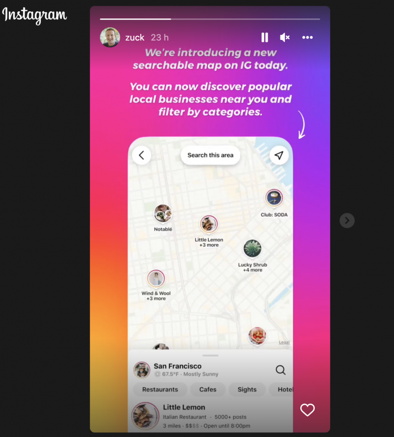 Au lieu d'afficher simplement les images les plus populaires ou les plus récentes publiées dans chaque lieu, Instagram donne désormais à voir un aperçu des meilleurs endroits à visiter de la scène locale, en affichant les stories qui y ont été réalisées, les photos et les vidéos, ainsi que les informations pratiques propres à chaque établissement.