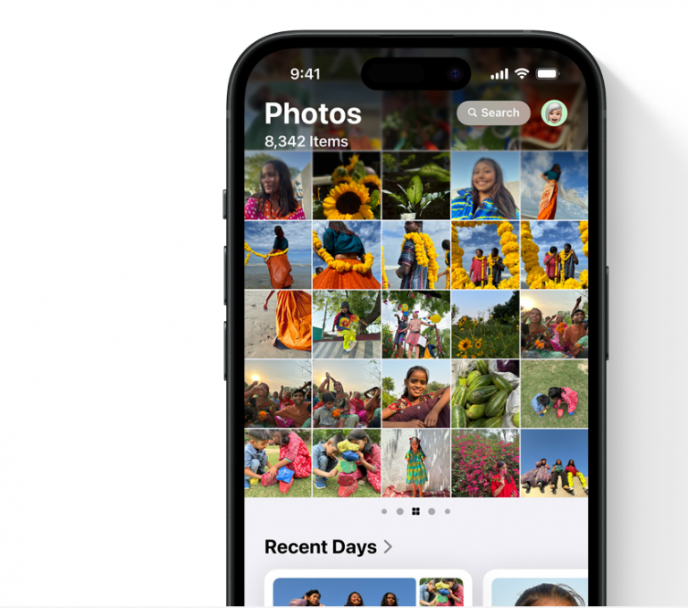 Apple profite de l'occasion pour offrir à l'application Photos sa plus grande refonte. Les images sont réorganisées dans des collections thématiques, comme les voyages, les personnes ou les animaux. Des collections épinglées permettent d'accéder facilement aux albums déjà créés. Une nouvelle fonctionnalité "carrousel" met en avant des photos issues de différents albums chaque jour. Le moteur de recherche de l'application gagne en profondeur avec la possibilité de chercher des éléments par date, lieu ou en tapant une courte description.