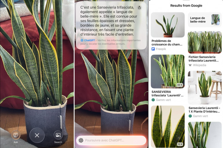 Les iPhone compatibles avec Apple Intelligence peuvent aussi profiter de l'amélioration de la recherche visuelle Visual Intelligence. Cette fonctionnalité permet de lancer une recherche sur le Web ou via ChatGPT à partir d'une image prise par le smartphone. Pratique pour obtenir des informations sur un vêtement croisé dans la rue, par exemple.