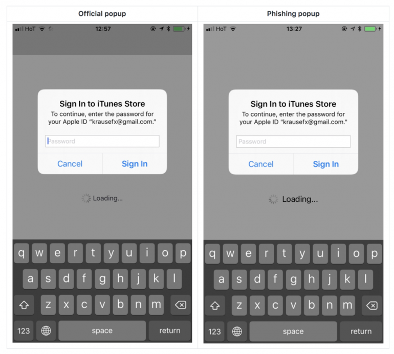 Dans un article publié sur son blog mardi 10 octobre, Felix Krause explique comment il a réussi à développer une copie de la boîte de dialogue officielle d'iOS pour démontrer que des tentatives de phishing pourraient facilement viser le logiciel d'Apple. Les différences entre les deux fenêtres popup sont quasiment imperceptibles à l’œil nu. Même un utilisateur d'iPhone chevronné pourrait s'y méprendre.