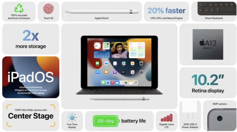 Apple a ouvert les débats en annonçant deux nouveaux venus dans sa gamme de tablette. Le moins cher des iPad au catalogue (389 euros) se modernise en adoptant la puce A13 de l'iPhone 11. Il récupère aussi la technologie d'écran TrueTone qui adapte les couleurs et la luminosité à la teinte de l'environnement ambiant. Compatible avec la première génération du stylet Apple Pencil, ce nouvel iPad peut faire office de bloc note interactif. Apple a aussi mis en avant la fonction Center Stage pour optimiser les appels en vision grâce à une technologie de suivi automatique des sujets. La configuration de base passe de 32 Go à 64 Go.