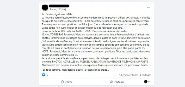 "Je n'ai rien signé avec Meta. La nouvelle règle Facebook, Méta commence demain où ils peuvent utiliser vos photos. N'oubliez pas que la date limite est aujourd'hui ! Cela pourrait être utilisé dans les poursuites contre vous. Tout ce que vous avez posté est publié aujourd'hui - même les messages qui ont été supprimés. Ça ne coûte rien, juste copier et poster, mieux que de regretter plus tard", indique notamment le message, qui évoque ensuite un texte de loi pour opposer à Facebook le droit d'utiliser les données personnelles de l'auteur de la publication.