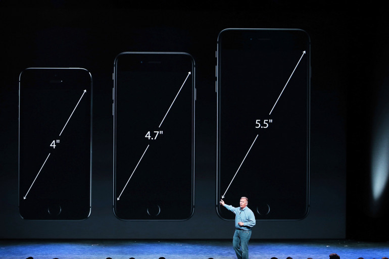 iPhones : (de G. à Dte.) iPhone 5S, iPhone 6, iPhone 6 Plus