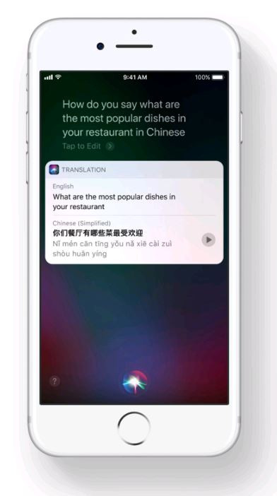 Siri sera aussi capable de traduire instantanément des phrases de l'anglais au français, chinois, espagnol, allemand et italien. Dans Apple Music, Siri pourra répondre à des questions du genre "qui joue de la batterie sur ce morceau". Grâce à une amélioration de sa technologie, l'assistant d'Apple pourra prononcer une même phrase avec différentes intonations. Les informations seront toujours chiffrées de bout en bout.