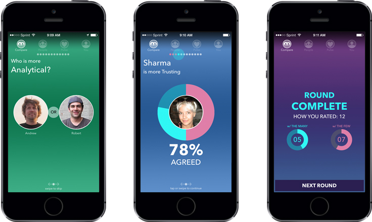 L’application propose une série de questions, du type "Qui est susceptible de finir plus tôt pour un rencard ?", "Qui a le plus d'assurance ?" ou encore "À qui peut-on faire le plus confiance ?".